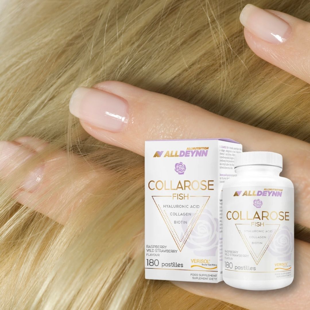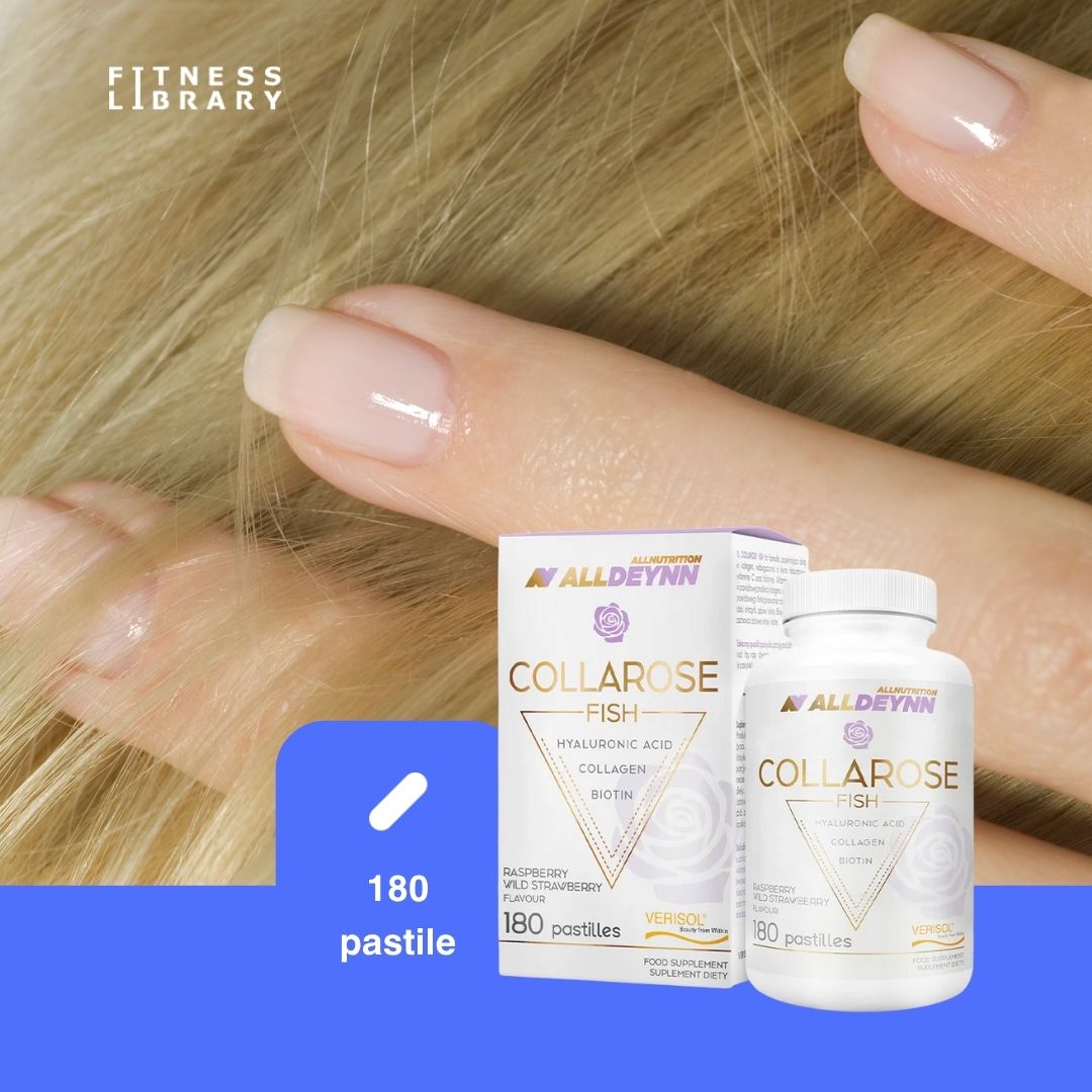 Collarose Fish Pastilles de la ALLDEYNN, cu 180 pastile și 90 de porții, reprezintă o soluție completă și delicioasă pentru a susține frumusețea din interior. Formula sa avansată, pe bază de colagen marin VERISOL® F, vitamina C, acid hialuronic și biotină, contribuie la menținerea sănătății și frumuseții pielii, părului și unghiilor.