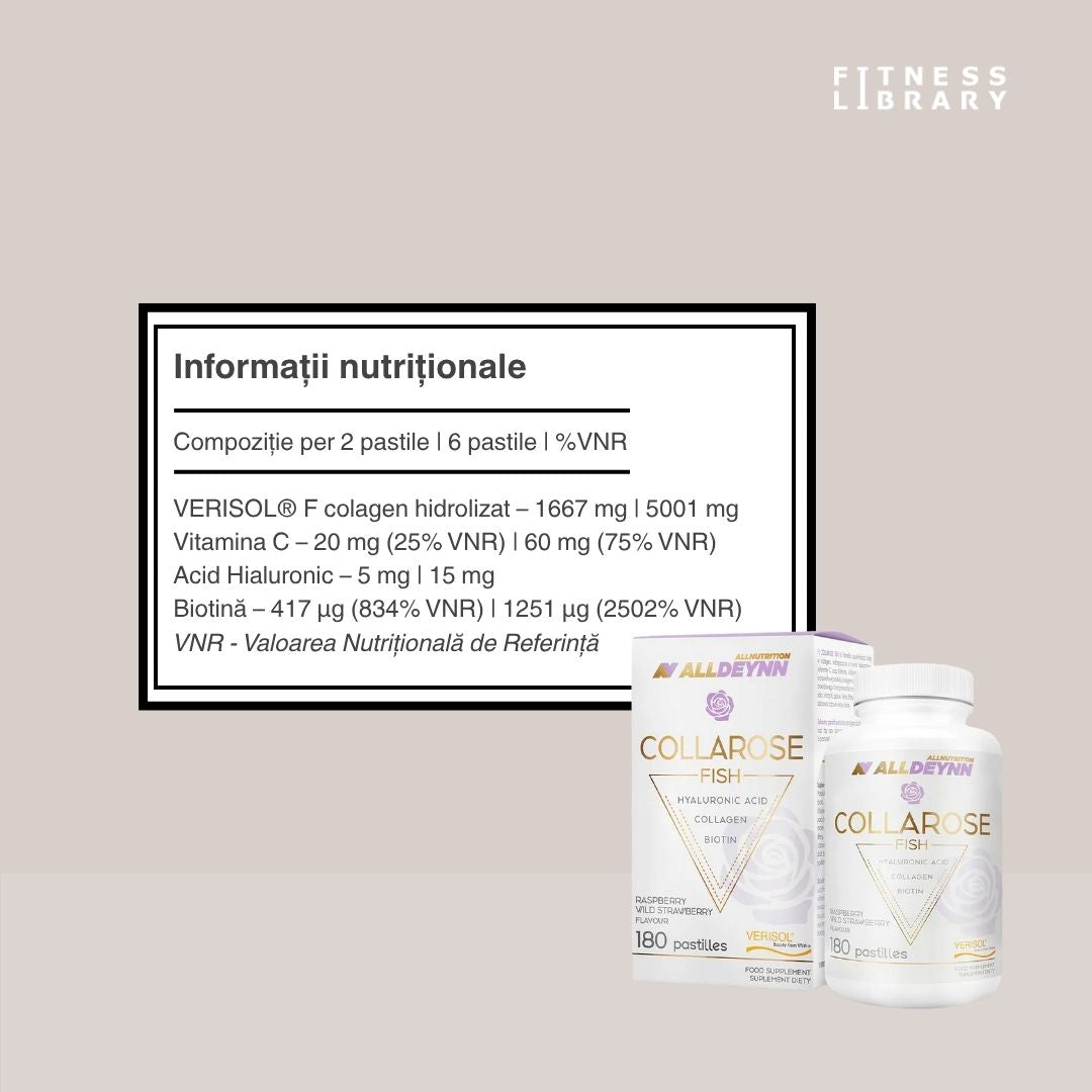 Collarose Fish Pastilles conține o combinație sinergică de ingrediente: peptide de colagen VERISOL® F, vitamina C, acid hialuronic și biotină. Lista completă de ingrediente include: îndulcitori (sorbitoli, sucraloză), VERISOL® F (peptide hidrolizate de colagen din pește), regulator de aciditate (acid citric), vitamina C (acid L-ascorbic), agent antiaglomerant (săruri de magneziu ale acizilor grași), acid hialuronic (hialuronat de sodiu), arome (zmeură, căpșuni), biotină (D-biotină) și colorant. Verificați lista completă de ingrediente pe ambalaj pentru a vă asigura că nu sunteți alergic la niciun component.