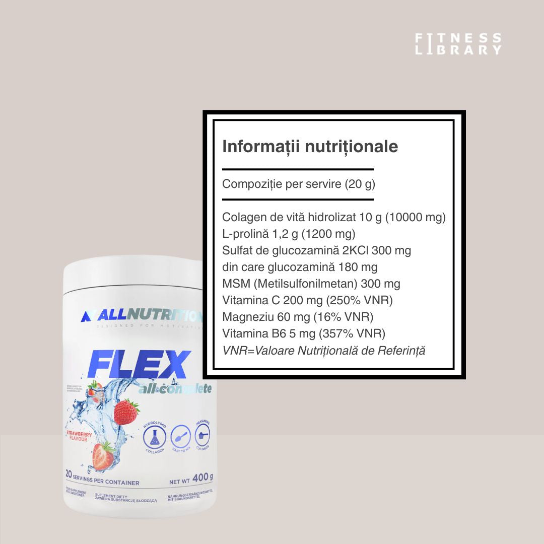 Flex All Complete de la ALLNUTRITION, cu 400g și 20 de porții, reprezintă o soluție completă și eficientă pentru sănătatea articulațiilor, oaselor, ligamentelor și tendoanelor. Formula sa avansată, ce combină ingrediente cheie precum colagen hidrolizat, L-prolină, glucozamină, MSM, vitamine și minerale esențiale, oferă suportul necesar pentru recuperarea rapidă și menținerea unui sistem locomotor sănătos.