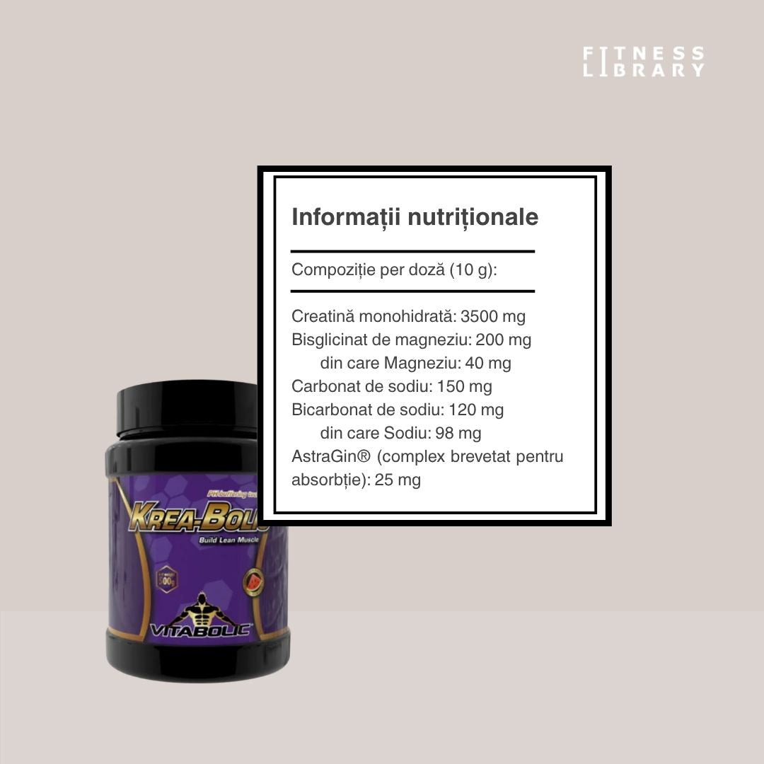 Complexul avansat de creatină Krea-Bolic de la VITABOLIC, prezentat într-un format economic de 500g ce asigură 50 de porții complete, reprezintă vârful de lance al suplimentării pentru performanță. Aceasta nu este o simplă creatină, ci un sistem biochimic inteligent, proiectat meticulos pentru a depăși fundamental limitările formulelor standard. Prin integrarea unei creatine monohidrat protejate de un sistem de tamponare alcalin, a unei forme superioare de magneziu și a unui amplificator de absorbție patentat, Krea-Bolic oferă o soluție completă pentru sportivii care refuză compromisul. Fiecare porție este concepută pentru a maximiza sinteza de ATP, a crește exponențial forța explozivă și a accelera procesele de recuperare, traducându-se direct în antrenamente mai productive și o dezvoltare musculară superioară, fără disconfortul digestiv asociat adesea cu alte produse.